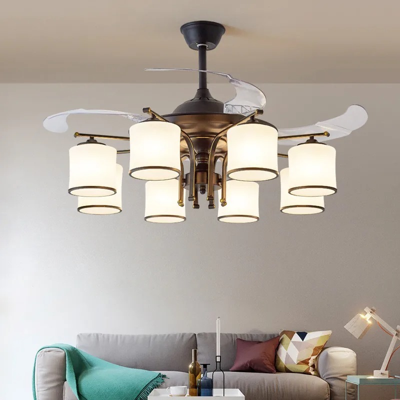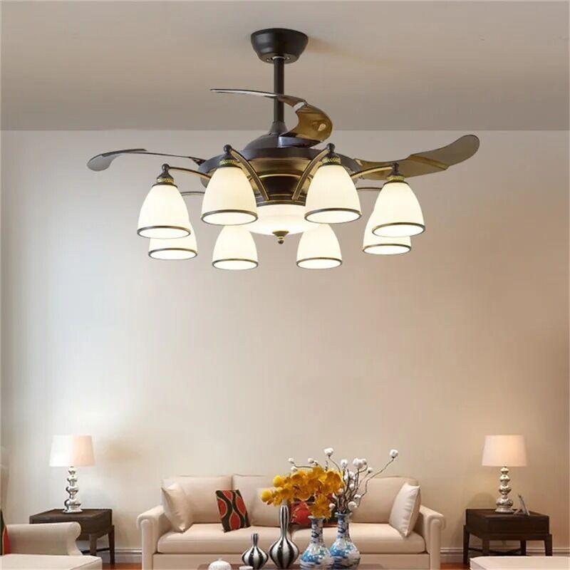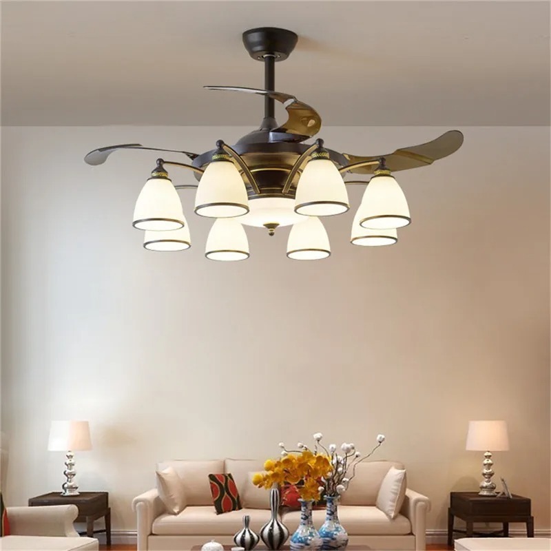 Luz de ventilador de techo de lujo LED remota Luz de ventilador eléctrico con pantalla de vidrio Luz de ventilador furtiva de metal (WH-VLL-28)